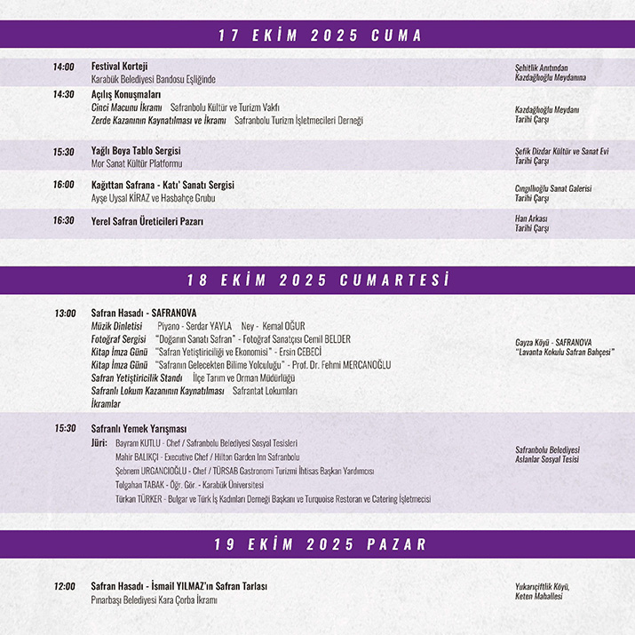 Festivalin son günü olan 19 Ekim Pazar ise geleneksel safran hasadı etkinliği ile sona erecek. Yüzyıllardır kente adını veren ve coğrafi işaretle tescillenen safran bitkisinin üretim alanlarında yapılacak hasat, misafirlere eşsiz bir deneyim sunacak.