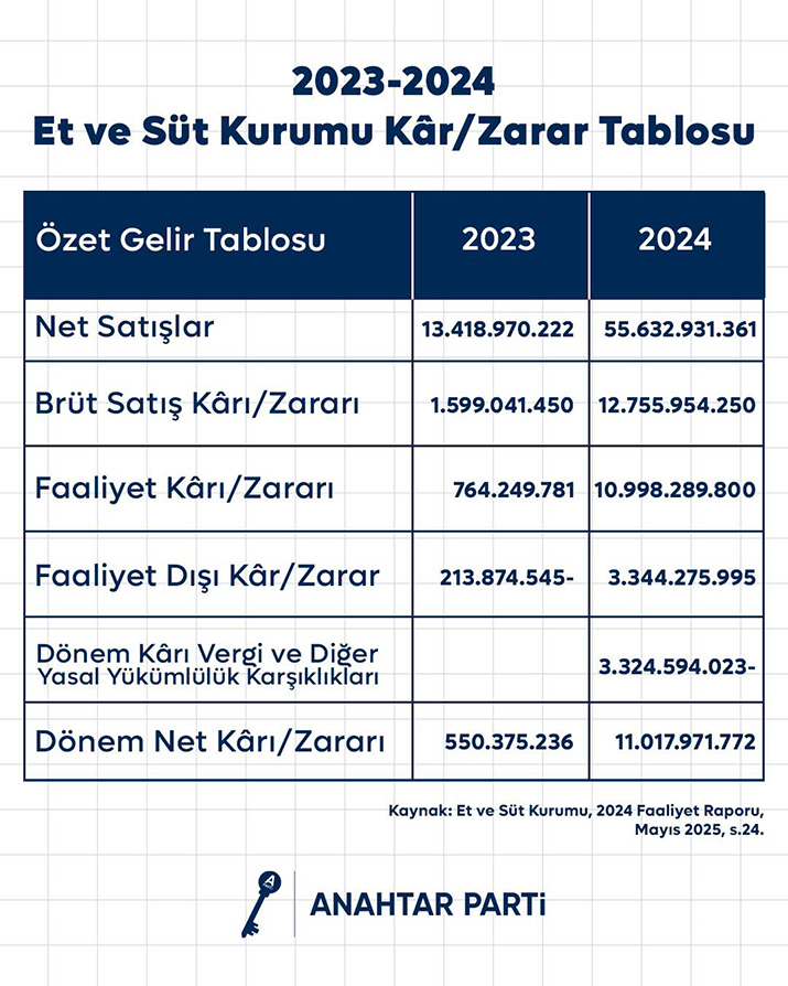Anahtar Parti Genel Başkanı Yavuz Ağıralioğlu sosyal medya hesabından yaptığı paylaşımda “Et ve Süt Kurumu’nun gelir tablosu tek başına yeterince konuşuyor.” dedi.