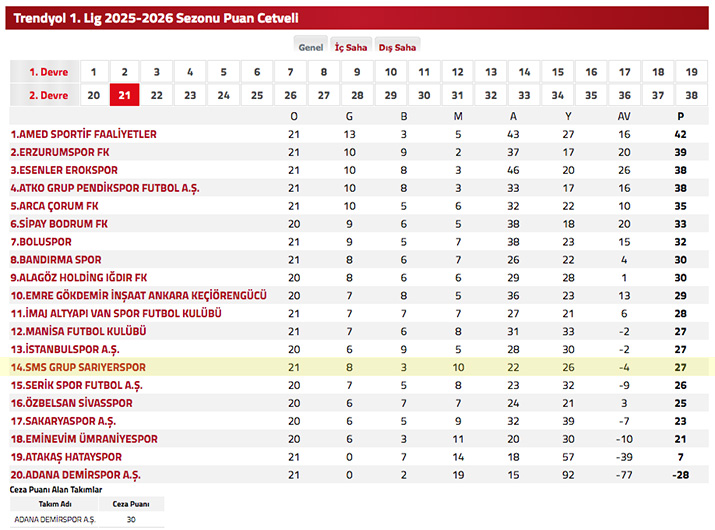 Bu sonucun ardından SMS Grup Sarıyer puanını 27'ye yükseltti. Boluspor ise 32 puanda kaldı.