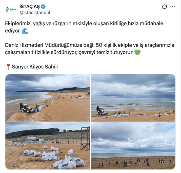 İBB'ye bağlı İSTAÇ ekipleri, Sarıyer Kilyos Sahili’nde yağış ve rüzgarın etkisiyle oluşan kirliliğe hızla müdahale ederek çevreyi temiz tutuyor.